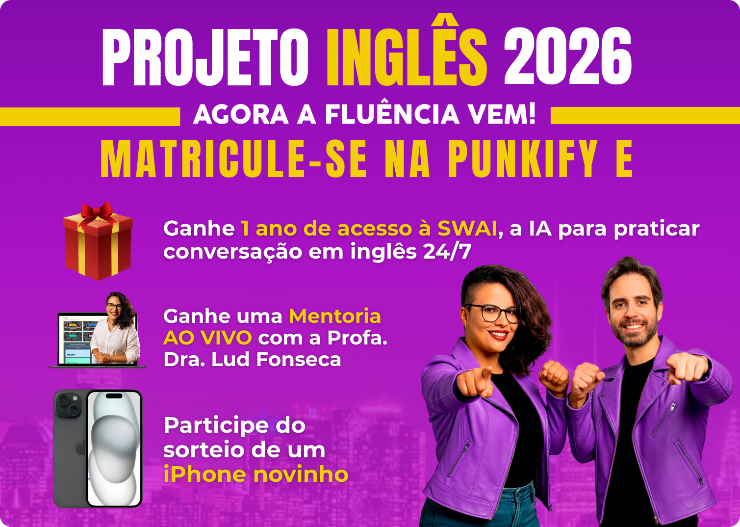 ✅ Matricule-se na Punkify em janeiro e: 🎁 Ganhe UM ANO DE ACESSO à SWAI, a IA para praticar conversação 24/7; 📖 Ganhe uma MENTORIA AO VIVO com a Profa. Dra. Lud Fonseca; 📱 Concorra a um iPhone novinho.